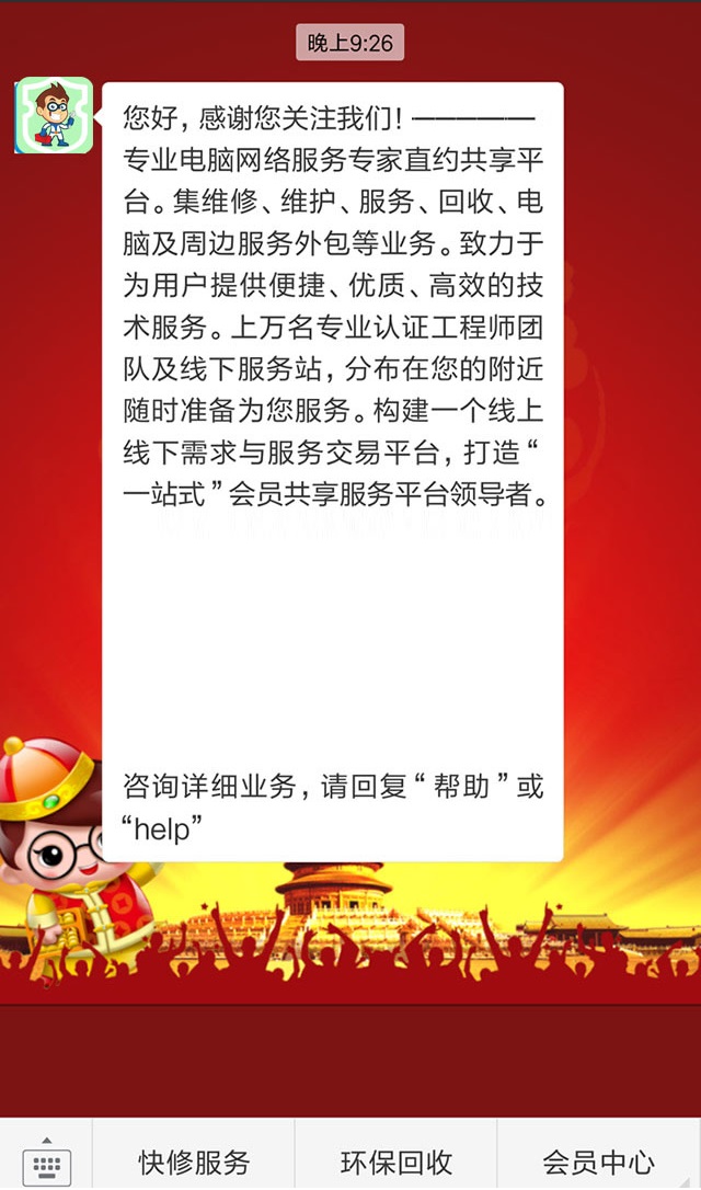 葡萄网络服务中心旗下的青果侠专业电脑网络服务专家直约共享平台。集维修、维护、服务、回收、电脑及周边服务外包等业务。我们的服务极速、高效,帮企业降低成本,提高效率。上万名专业认证工程师团队及线下服务站,分布在您的附近随时准备为您服务。青果侠遵循“品质优良才值得信赖,服务专注才赢得满意”的核心价值观。建立一个完善的线上需求与服务撮合平台,用户通过青果侠平台,可以快速匹配附近的电脑专家,并可获得优质的上门服务。服务商亦可借助青果侠迅速对接到客户需求,大大提升服务效率,进而获得更为丰厚的收入回报。